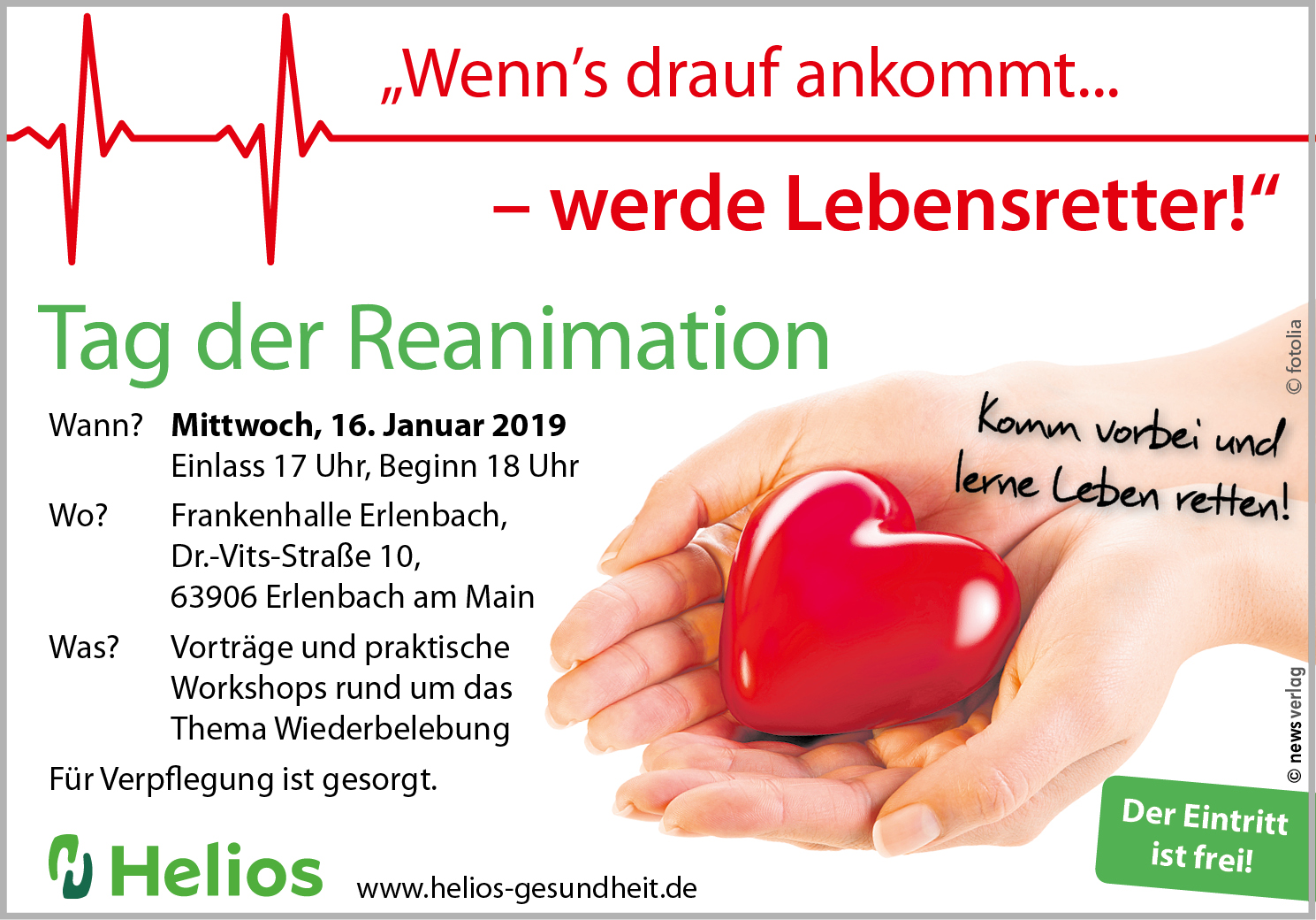 Aber Deutschland braucht mehr Ersthelfer, denn die aktuelle Bilanz ist alarmierend: Nur 15 Prozent der Bundesbürger helfen im Ernstfall. Dabei kann Wiederbelebung so einfach sein: „Prüfen. Rufen. Drücken!“ sind drei leicht zu merkende Schritte bei einem Herzstillstand: Reaktion und Atmung checken, Notruf 112 wählen und die Herzdruckmassage sofort beginnen. Die Helios Kliniken Miltenberg-Erlenbach möchten hier ansetzen und laden deshalb am 16. Januar 2019 zu einem kostenlosen Informations- und Aktionstag ein. Ziel ist, das Bewusstsein für lebensrettende Fähigkeiten zu schärfen, Hemmschwellen abzubauen und über lebensentscheidende Sofortmaßnahmen zu informieren.