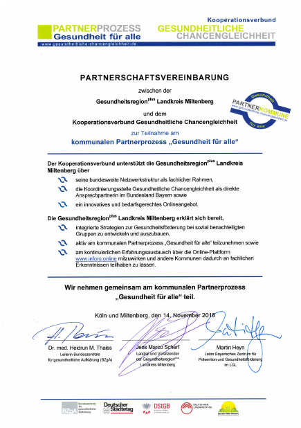 Am 14. November 2018 ist die Gesundheitsregionplus Miltenberg dem Partnerprozess "Gesundheit für alle" des bundesweiten Kooperationsverbundes Gesundheitliche Chancengleichheit beigetreten. Darin erklärt sie sich unter anderem bereit, integrierte Strategien zur Gesundheitsförderung bei sozial benachteiligten Gruppen zu entwickeln und auszubauen. Bei der Fachtagung zum Thema "Gesundheitliche Chancengleichheit für den Landkreis Miltenberg" arbeiteten Experten, Akteure und Anbieter aus dem Bereich zusammen an Lösungsvorschlägen für die Verbesserung der Gesundheitlichen Chancengleichheit im Landkreis Miltenberg. Die Dokumentation zur Fachtagung kann hier heruntergeladen werden.