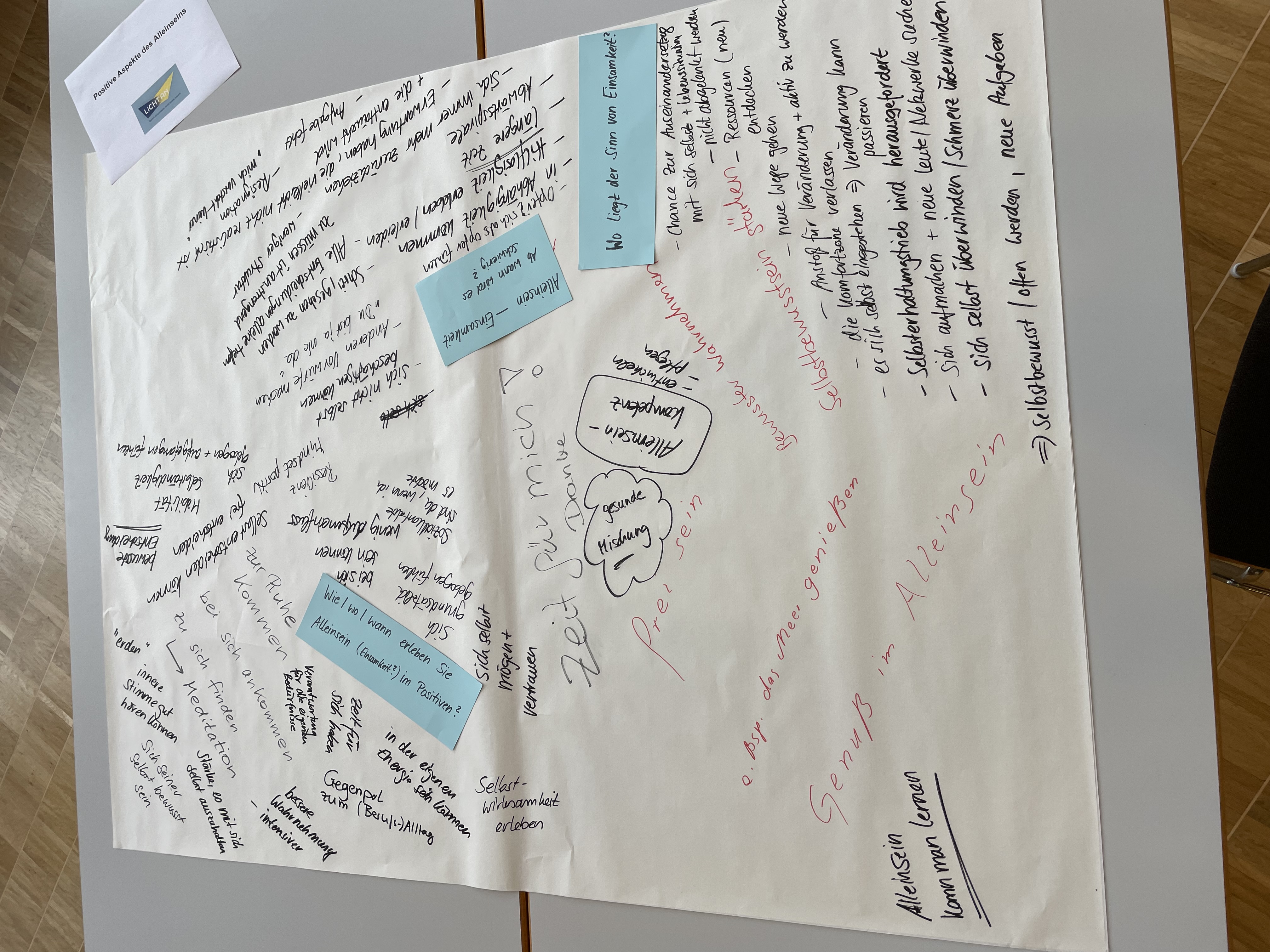 Als Essenz aus diesem Workshop ergibt sich, eine „Alleinsein-Kompetenz“ von klein auf zu fördern und zu erlernen. Diese Kompetenz sollte ein Leben lang weiter-entwickelt und gepflegt werden: